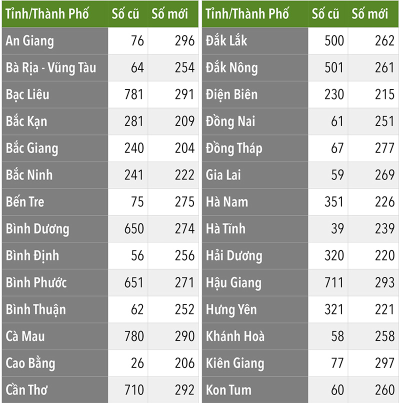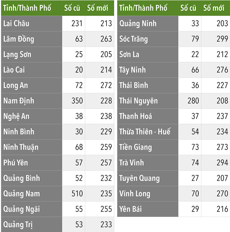 | Tỉnh/Thành | Số cũ | Số mới | Tỉnh/Thành | Số cũ | Số mới |